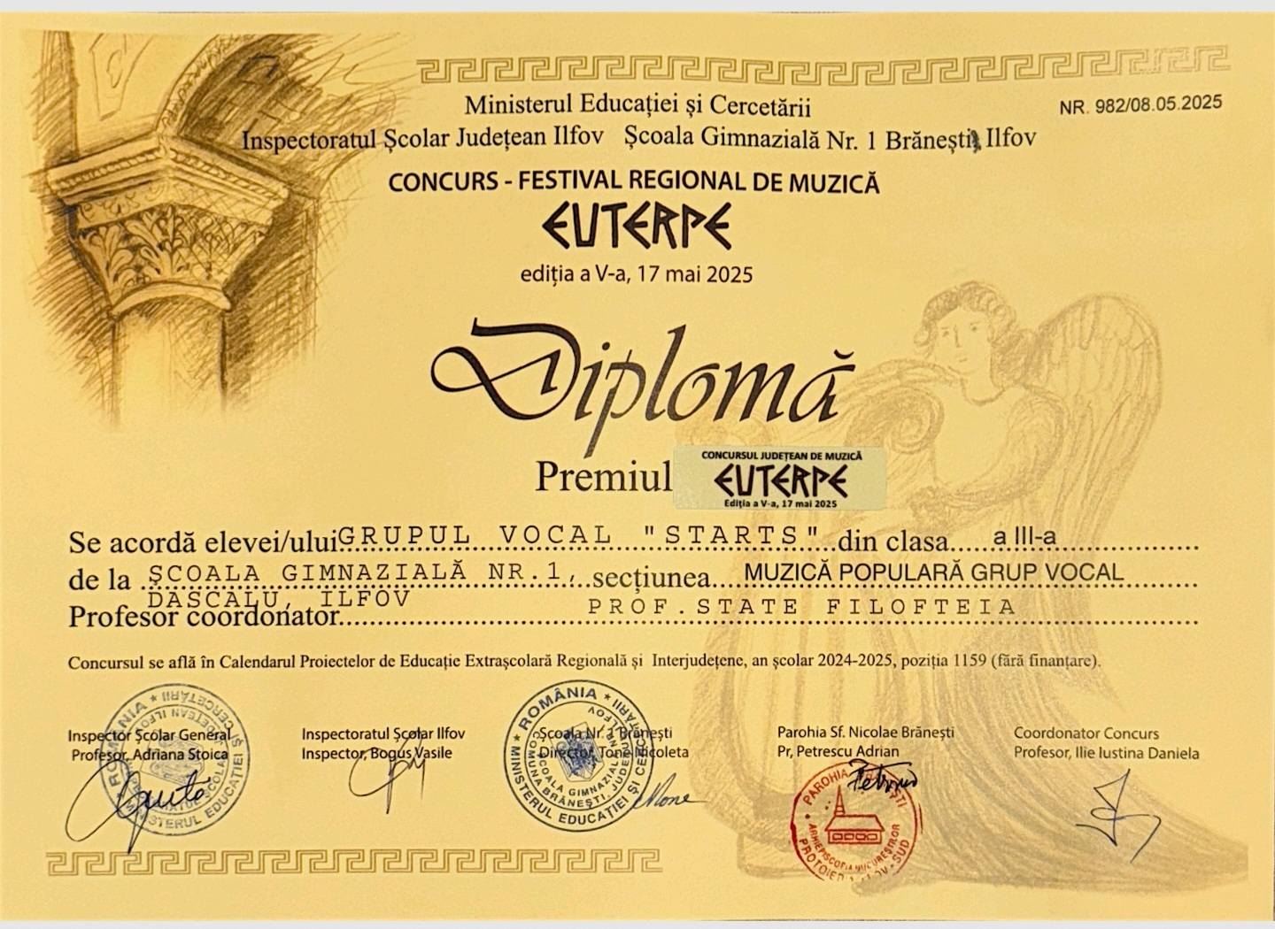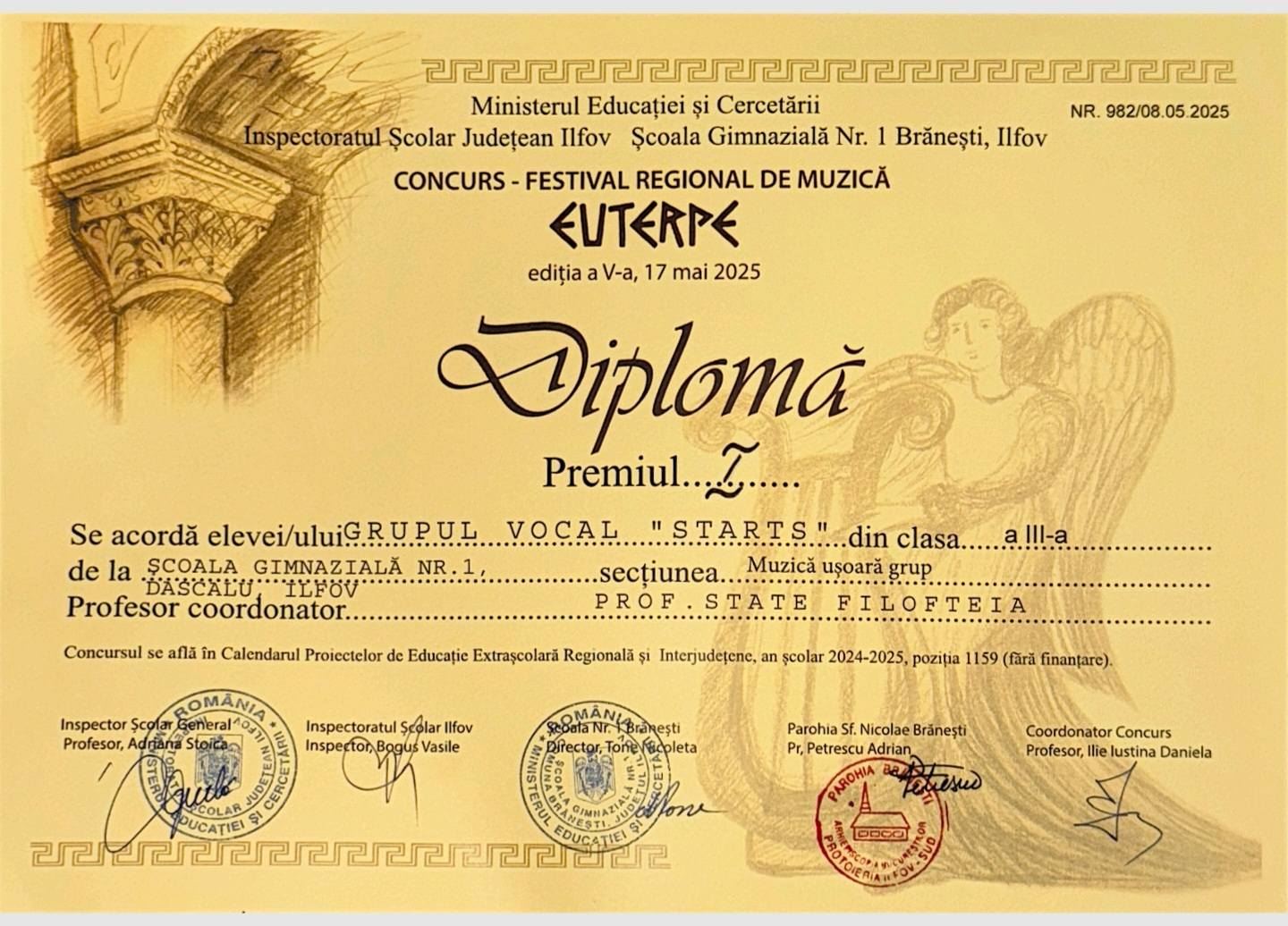 Felicitări sportivilor noștri care fac parte din Grupul Vocal “Stars”, coordonat cu pasiune de Prof. Filofteia State, pentru rezultatele deosebite obținute la Festivalul Regional de Muzică “EUTHERPE” – ediția a V-a: